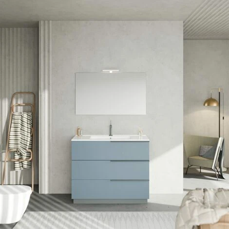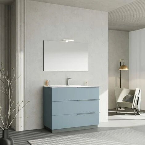 ARREDO BAGNO A TERRA DA 100CM CELESTE CON LAVABO IN CERAMICA E SPECCHIO 100X60 CON LAMPADA