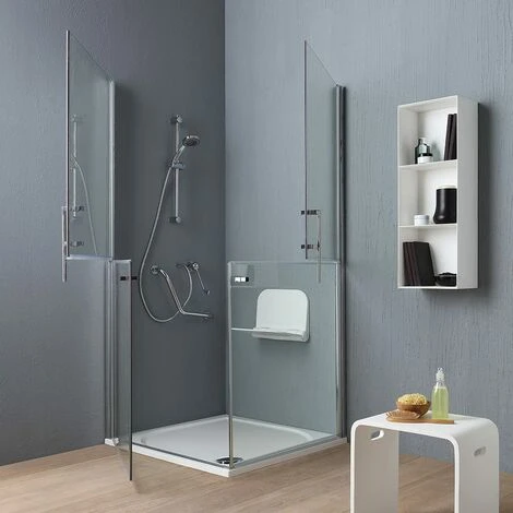 Kiamami Valentina arredo e accessori per il bagno pensa proprio a tutti. Questo box doccia angolare da cm. 90×90 h. cm. 190 con ante in cristallo temperato da 6 mm ha la particolarità di avere la doppia apertura a battente per un accesso facile e sicuro ideale per anziani e meno abili.