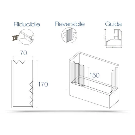- Le guide possono essere facilmente tagliate (fino a 10 cm per lato) con un seghetto per adattare il prodotto a tutti i piatti doccia.