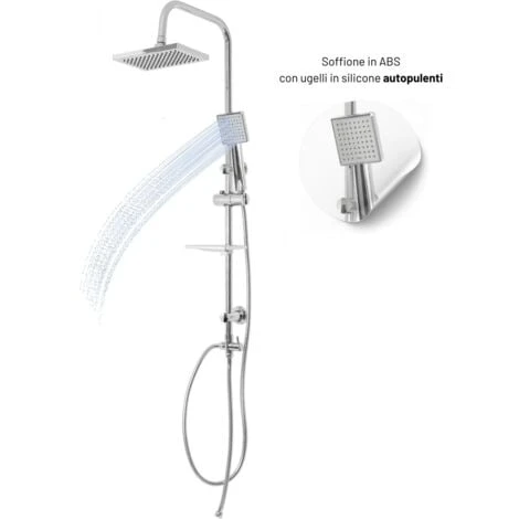 - Il soffione quadro 20×14,5 cm con ugelli anticalcare autopulenti e la doccette quadra ad un getto in ABS per getti d’acqua localizzati in diverse parti del corpo