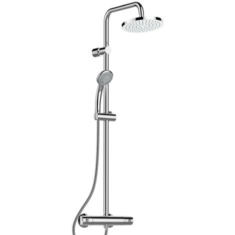 Colonna doccia con termostatico, supporto doccetta con scorrimento a pressione. Doccetta di diametro 80 mm con riduttore di portata a 8 l-min. Soffione di diametro 200 mm. Asta murale da 1051 mm con diametro 25 mm. Tubo flessibile ultrafl ex da 1750 mm. Termostatico esterno doccia con Tecnologia Cool Body che garantisce protezione da eventuali scottature. Raccordi ad S da 1-2. Blocco della temperatura a 40 gradi. Tasto EKO per riduzione della portata dell’acqua fino al 50 per cento.
