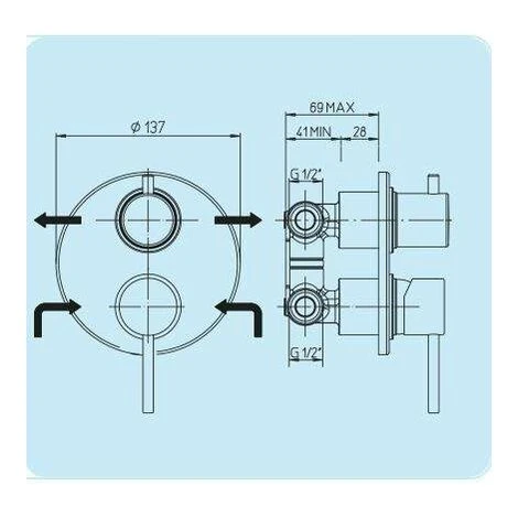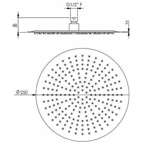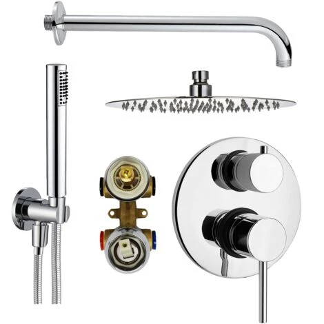Kit completo per doccia modello tondo completo di miscelatore con deviatore e attacco per pareti in cartongesso, questo kit comprende un braccio doccia 30 cm e un soffione doccia Ø25 cm in acciaio inox.