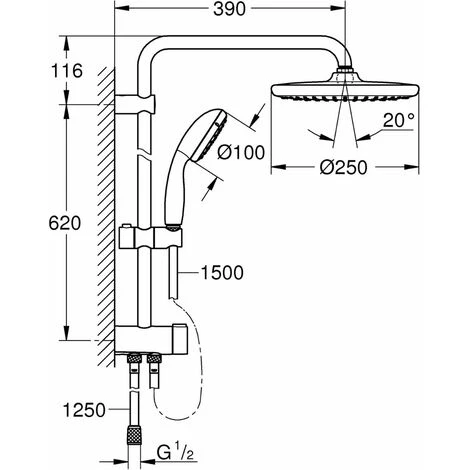 - installazione flessibile: collegamento all’attacco dell’acqua, attacco a parete per l’approvvigionamento idrico con 1/2″ al miscelatore o al tubo flessibile doccia 1250 mm