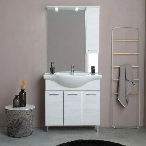 MOBILE BAGNO A TERRA 85 CM 3 ANTE QUERCIA BIANCO, LAVABO E SPECCHIO
