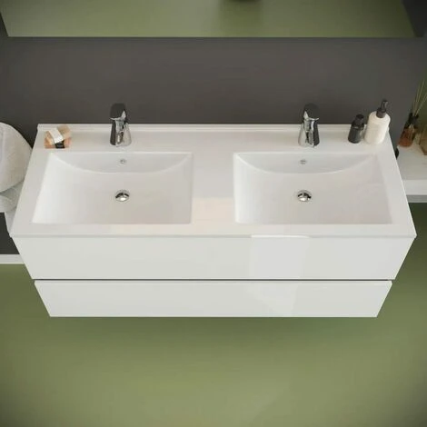 MOBILE BAGNO 120 CM BIANCO LUCIDO CON DOPPIO LAVABO IN CERAMICA E SPECCHIO A FILO