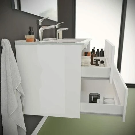 Benaco, è la nuova serie di mobile bagno sospeso, che qui vi presentiamo nella dimensione di 120cm bianco lucido e con il doppio lavabo. La base è composta in legno nobilitato certificato FSC e con una bordatura in abs da 2mm mediante l’utilizzo di colle specifiche che aumentano la resistenza dei pannelli all’umidità, e rifinito in bianco lucido. La base è predisposta con 4 cassetti, dotati di apertura agevolata a gola, impreziosita da un inserto grigio, e con una chiusura rallentata. Il fianco dei cassetti è in legno mentre il frontale è in MDF. Il doppio lavabo è in ceramica di prima scelta con foro per il rubinetto e il troppopieno. La composizione si completa con una specchiera con telaio in legno nobilitato sempre bordato in abs grigio.