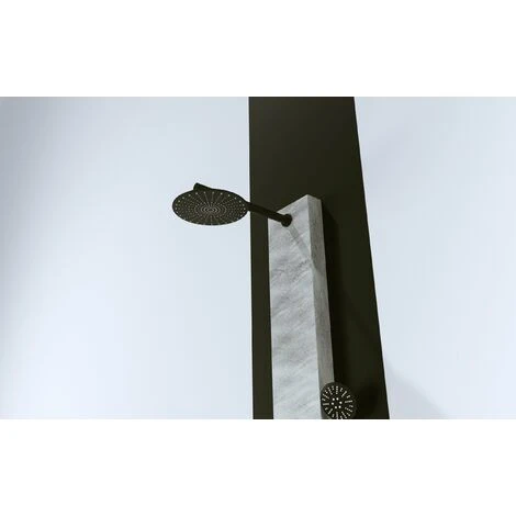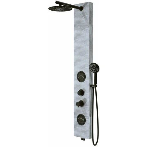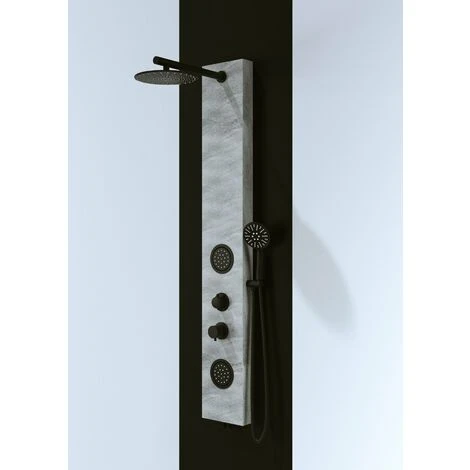 Il corpo del pannello doccia proposto è realizzato in acciaio inox inossidabile con finitura in effetto pietra color grigio , particolari nero opaco , ideale per abbinamenti con i nostri piatti doccia effetto pietra .