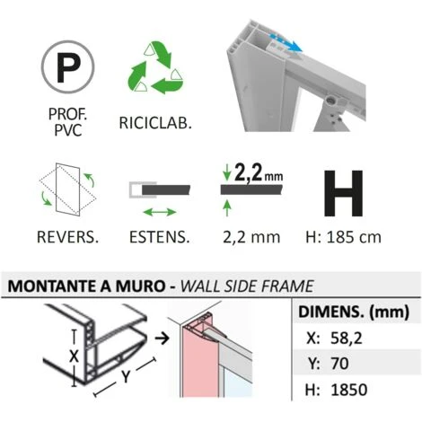- Tolleranza di 2 cm per il corretto montaggio anche su pareti fuori squadro (120 CM regolabile da 118 CM a 120 CM)