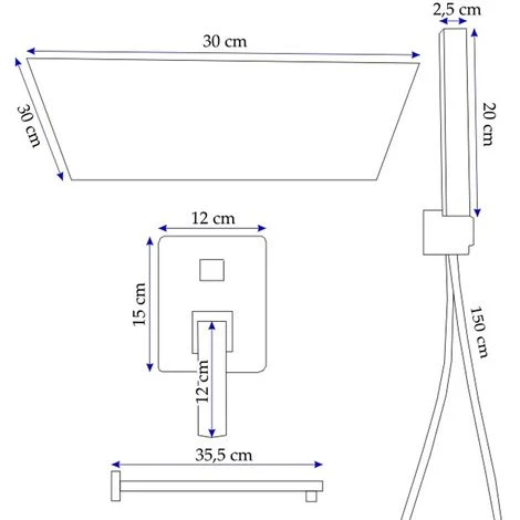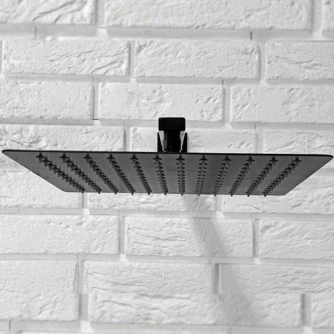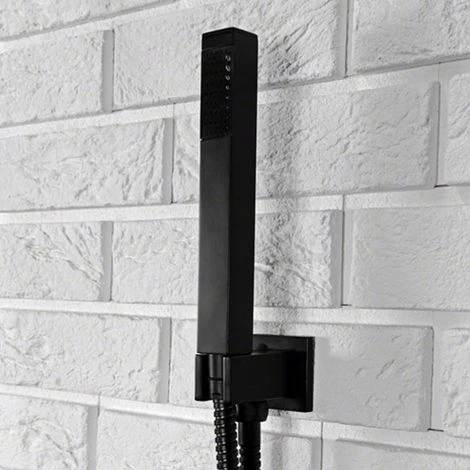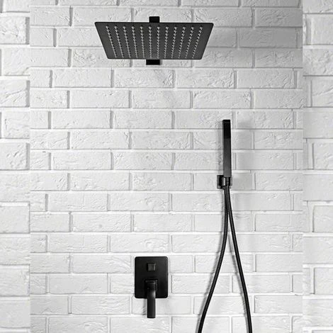 Set doccia incasso nero total black, composto da doccino nero, supporto nero in ottone, miscelatore a due vie nero meccanico. Braccio soffione nero da 35,5cm , tubo flessibile nero doppia aggraffatura, soffione nero in acciaio saldato nero 30×30