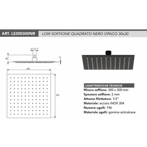 Soffione doccia in acciaio inox 304 modello quadro colore nero opaco | Tecom LSNR