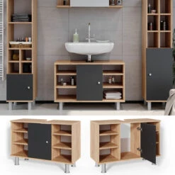 Il mobiletto con ante offre spazio abbastanza per la carta igienica. asciugamani. detersivo. detergente per la toilette e altri piccoli oggetti da tenere.